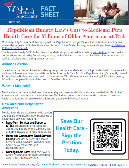 The Alliance for Retired Americans strongly opposes any plans to cut Medicaid. The Republican Party is proposing to put health care at risk for 72 million Americans, including: 8.3 million older adults, 9.1 million people with disabilities, and 31.5 million children.